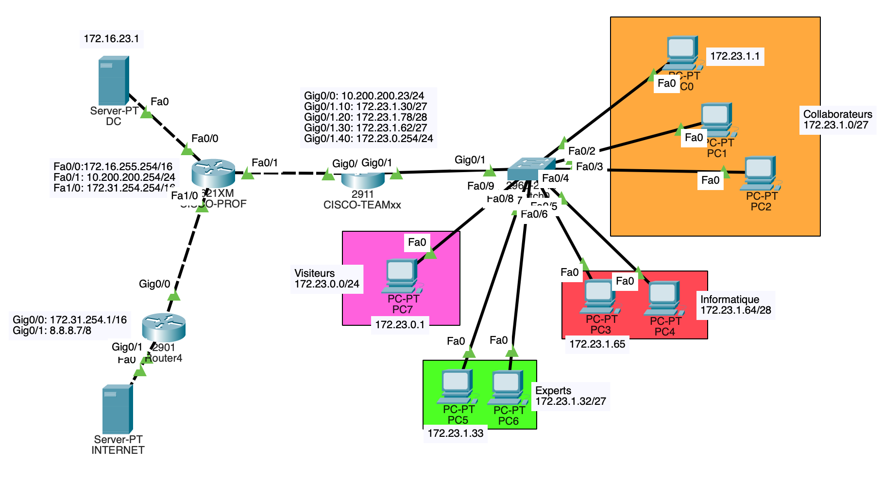 Conception d’une architecture réseau segmentée en VLAN (Collaborateurs, Informatique, Experts, Visiteurs) avec plan d’adressage documenté.